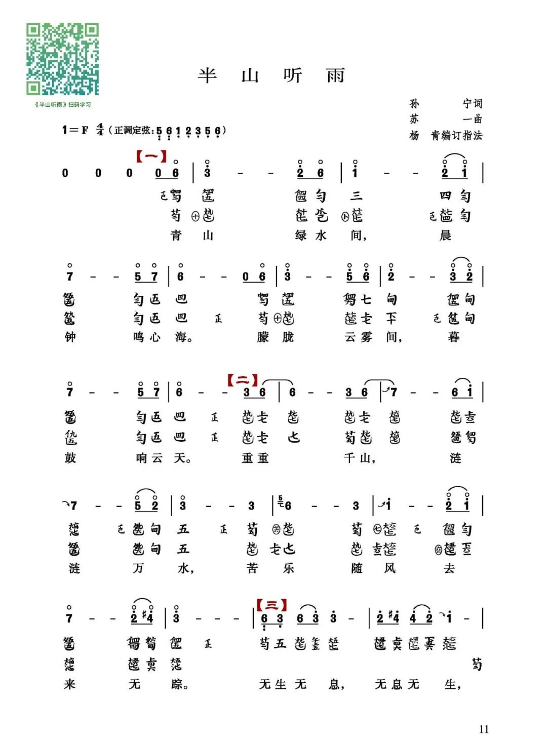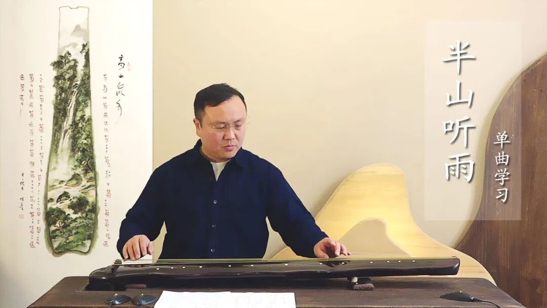 《半山听雨》是一个古琴音乐专辑,由苏一老师作曲,杨青老师编配古琴谱并演奏。专辑中收纳了十三首乐曲,出版发行后得到了广大琴友与喜欢传统音乐艺术的各界朋友的喜爱。其中,尤以琴曲《半山听雨》为代表作。此曲用琴音模拟雨水自然滴落的声音,将写景与抒情相结合,表现了山色空濛、宁静安详的雨中世界,令人神往,可让人摆脱城市的喧嚣和世俗的浮躁。弹奏《半山听雨》时,注意泛音要晶莹圆润,用颗粒感表现天籁之音;同时按音要准确,用线性感表现绵绵不绝之意。雨声入耳若有心,身在何方皆半山。愿这一曲《半山听雨》如春雨润物,给您带来一丝心灵的慰藉。