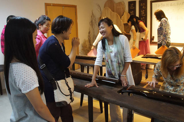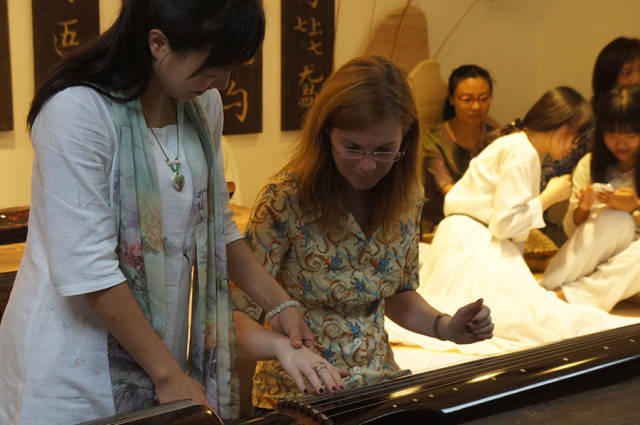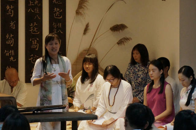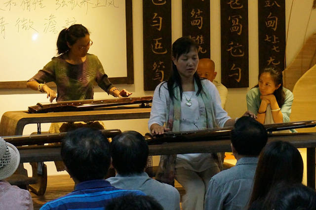 杨芬老师在讲座中谈到吟咏与情性,诗言志,歌永言,古人多用吟咏来抒发情怀。《诗经》乐而不淫,哀而不伤,是适合吟唱的佳作。当谈及习琴技艺的时候,杨芬老师说,其实弹琴的技巧并不是最重要的,重要的是打开自己的身心,以弦歌养正风。如果盲目的将习琴作为学习的任务去完成,往往不能体会到古琴真正的意义,而是应该将习琴作为一种修行,修身养性,澄怀观道,每个人都可以通过弹琴净化身心,在心中绽放莲华。杨芬老师还详细示范了许多指法,如果心有旁骛,弹琴的时候着急的去完成下一个音,音与音之间就会是牵连浮躁的,而如果真正的沉静下来,去全身心的弹奏每一个音,那么音与音之间看似空白,其实更加意境无限。恰如老子《道德经》所言,有无相生,方致清微澹远之境。 雅集琴曲演奏为杨芬第六期佛曲班学员 分享会的第二部分是佛曲。杨芬老师和学员共同吟唱了《插秧偈》《南无阿弥陀佛》《药师佛号》数曲。气氛庄严静穆,观众不觉端坐身姿,跟随念诵。佛曲唱罢,是气势磅礴的《南风歌》和《诗经·小雅·鼓钟》,与之前的弦歌风格殊异,壮阔辽远,振奋人心。分享会的最后,杨芬老师独奏了从日本回流回来的琴曲《虚铃》,清妙无比,颇有禅意。 分享会结束之后,琴友意犹未尽,围绕在杨芬老师身边交流提问,久久不愿离去。德国友人Steffi慕名而来,杨芬老师手把手教她古琴“勾”“挑”指法,Steffi 难掩对古琴的喜爱之情,约定以后有机会跟随杨芬老师在度一琴馆习琴。许多琴友也纷纷表达了对度一琴馆的肯定和赞誉,装修之后的人民大学学区环境更为幽静雅致,今日的分享会良辰美景赏心乐事四美俱全,杨芬老师、众学员和琴馆为此付出的心血令人感动。大家对度一琴馆开设的心灵古琴佛曲弦歌课程萌发了浓厚的兴趣,更有琴友当场报名。 度一琴馆以后将会举办更多公益性活动以飨古琴爱好者,更多信息,请关注度一学堂网站:www.dyxt.org。